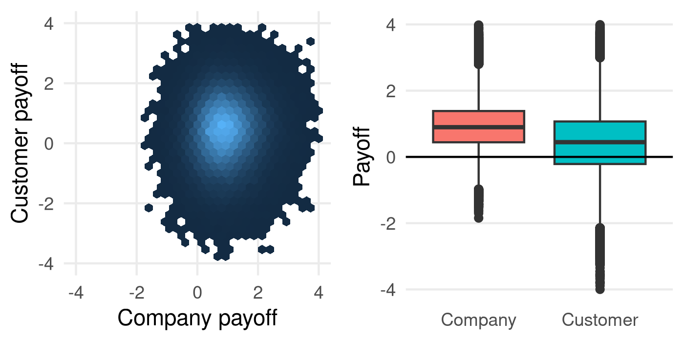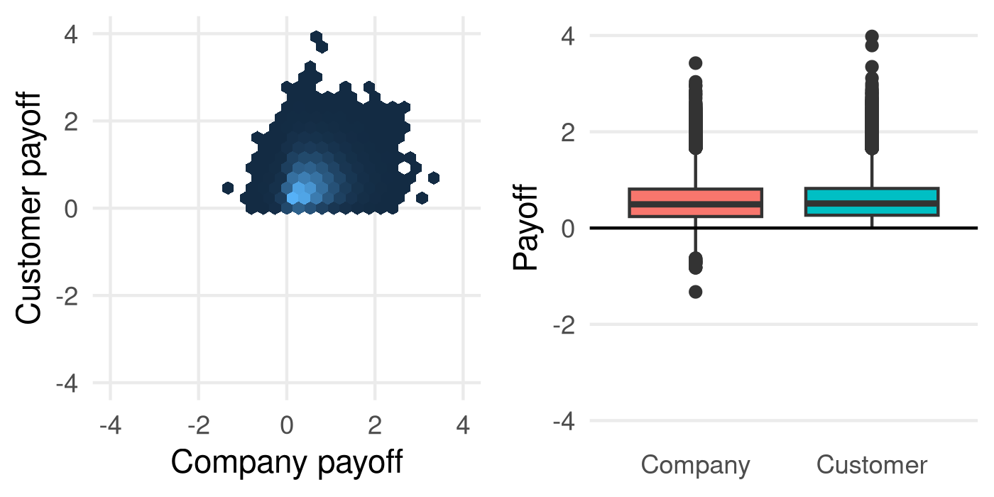 - Companies and Customers show a healthy distribution of positive payoffs.