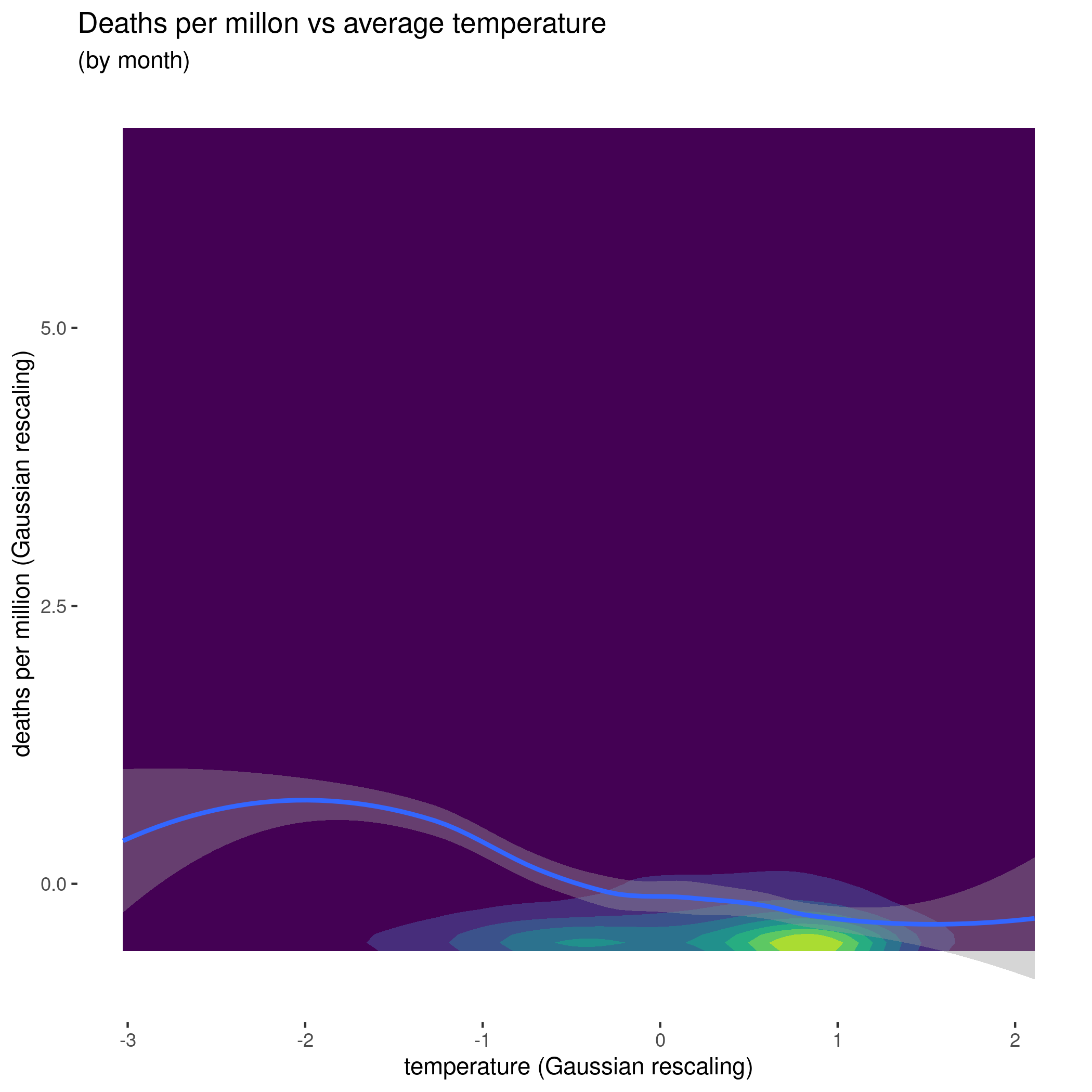 - Fitting a simple model of the impact of average temperature (by month and country) on deaths, which does a bit to put on the same footing countries with very different climates.