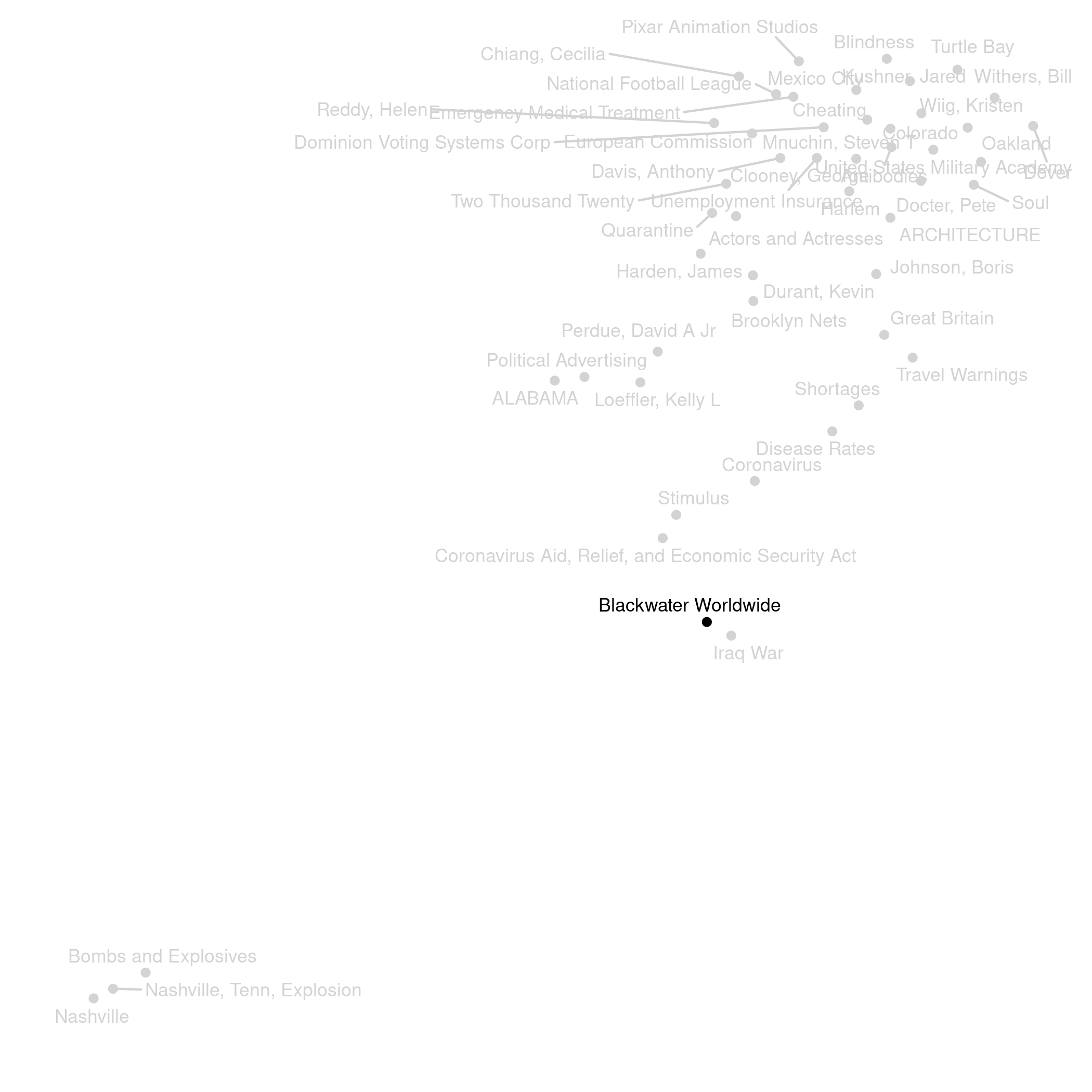 The two smaller panels at the top are a bit more experimental. The leftmost panel shows a topic map representing relationships between the topics based on how often they are talked about in the same articles. For example, in the map below Blackwater Worldwide is paired with Iraq War, as the company was in the news linked to events that happened during that war.