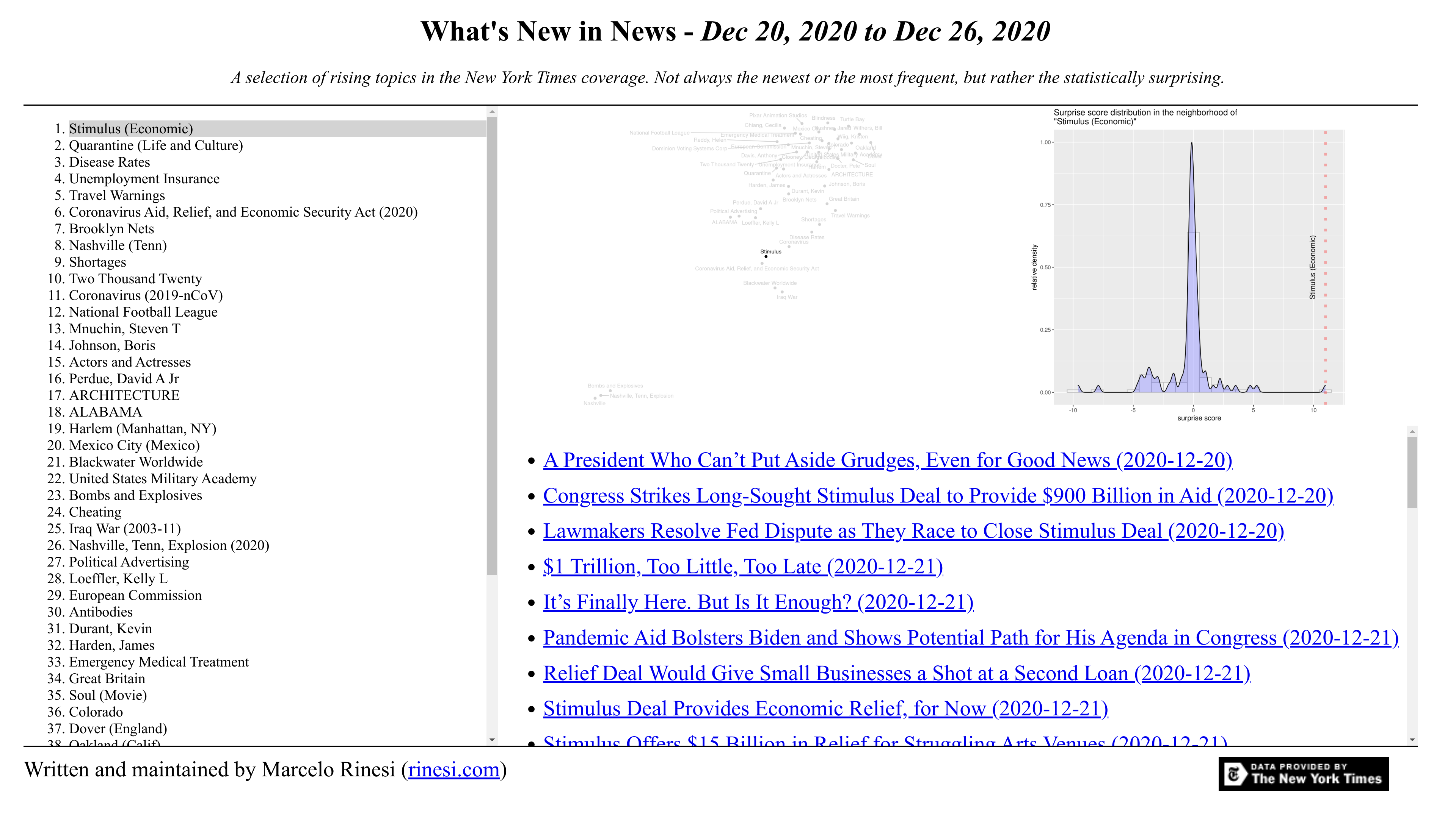 To the left there's a list of the fifty "most surprising" topics. Clicking on them loads into the bottom-right panel a list of links to all the NYT articles written about that topic during the week.
