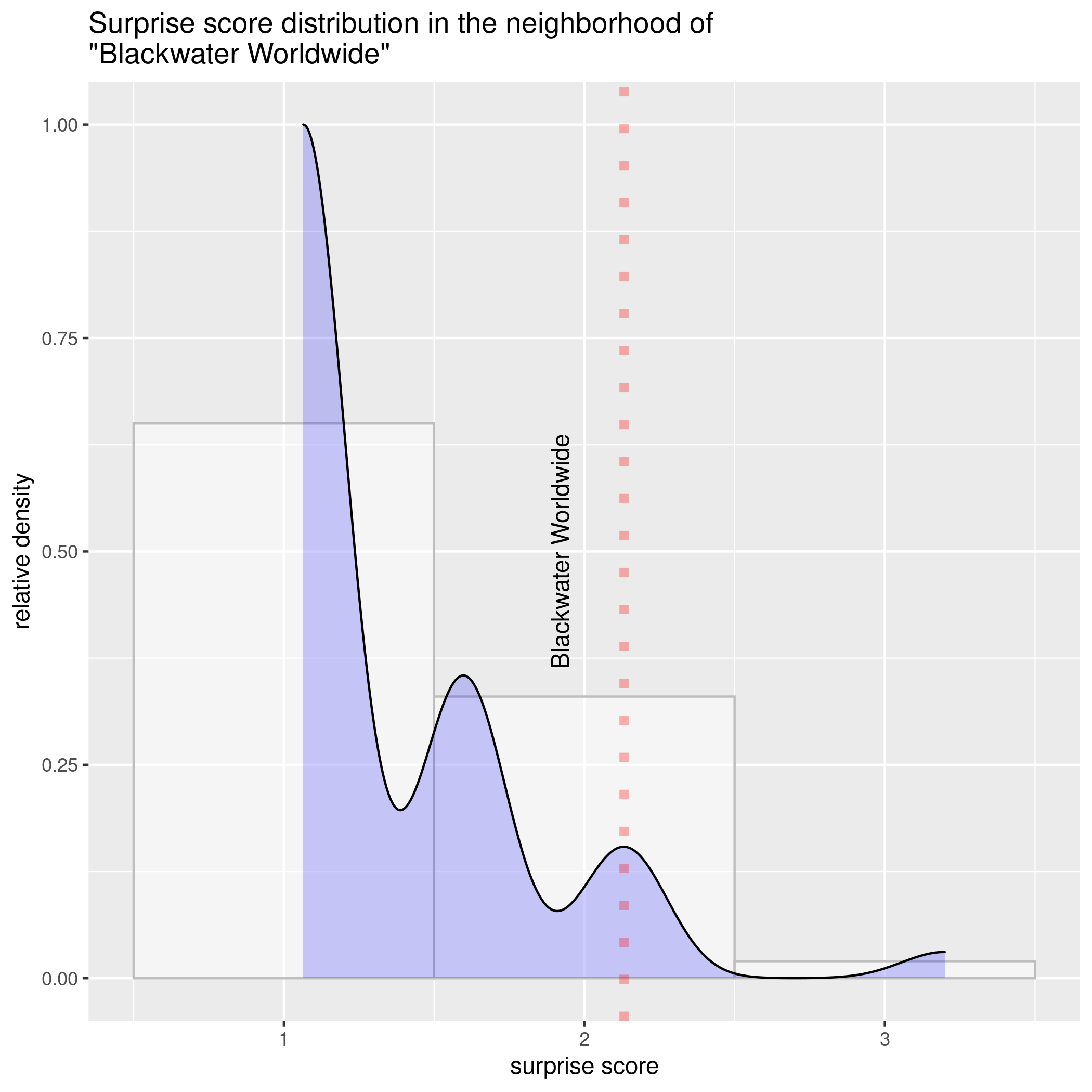 The final panel on the top-right corner explains why the system thinks the topic is interesting. In short, it fits a very simple statistical model to try and predict how many articles will mention each topic in the last week, and then assigns a "surprise score" to each article based on how wrong it was (focusing on the topics that got more articles than expected). The graphic shows the distribution of surprise scores for topics with a pattern of past mentions similar to the selected topic, and the selected topic's specific surprise score. In a very approximate way, it gives an idea of how surprising the topic is among similarly frequent topics: the more to the right the red line, the more surprising the topic's level of coverage was.