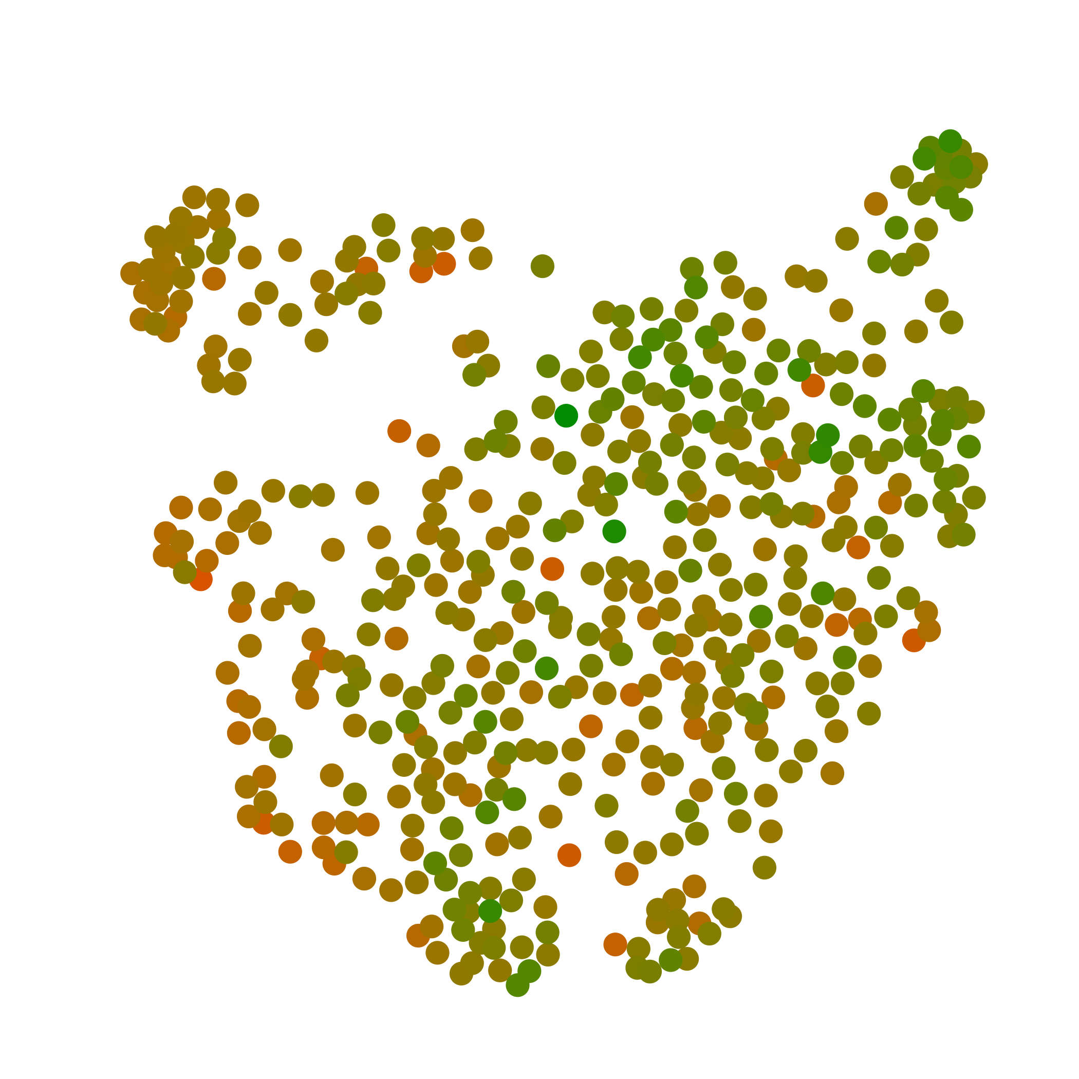 One of the uses of data science is precisely that, to attempt to see something using new frameworks; there's always one, whether deliberate or not, so it pays to explore different ways to look at the world, and the most interesting ones are often the least "human." So we can apply standard data analysis tools and try to see how the S&P 500 looks, as a whole, to itself. None of these technical choices is unique or necessarily optimal: I used the Pearson correlation between weekly returns to build a metric between stocks, and then the well-known UMAP algorithm to transform that metric into a two-dimensional map of the market.