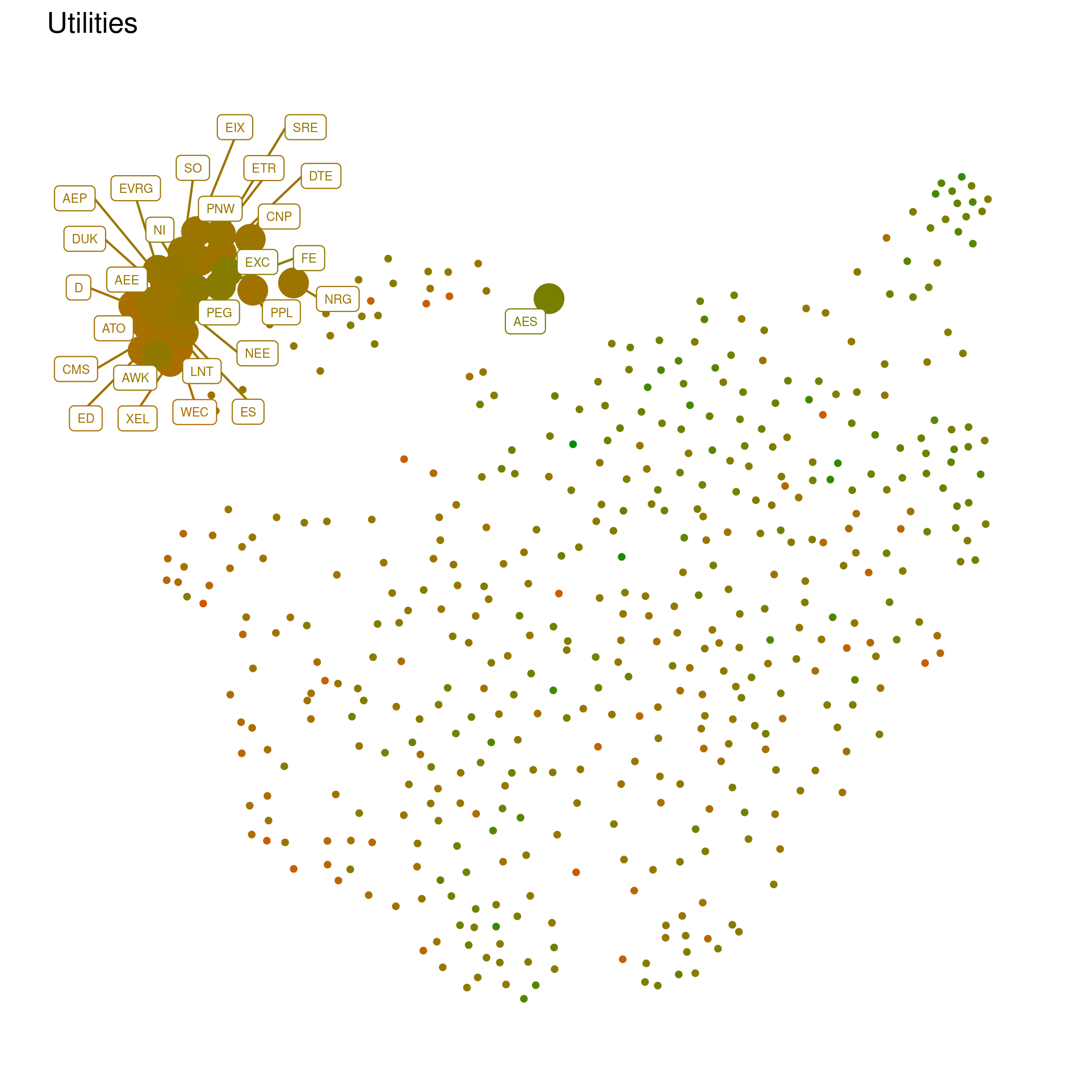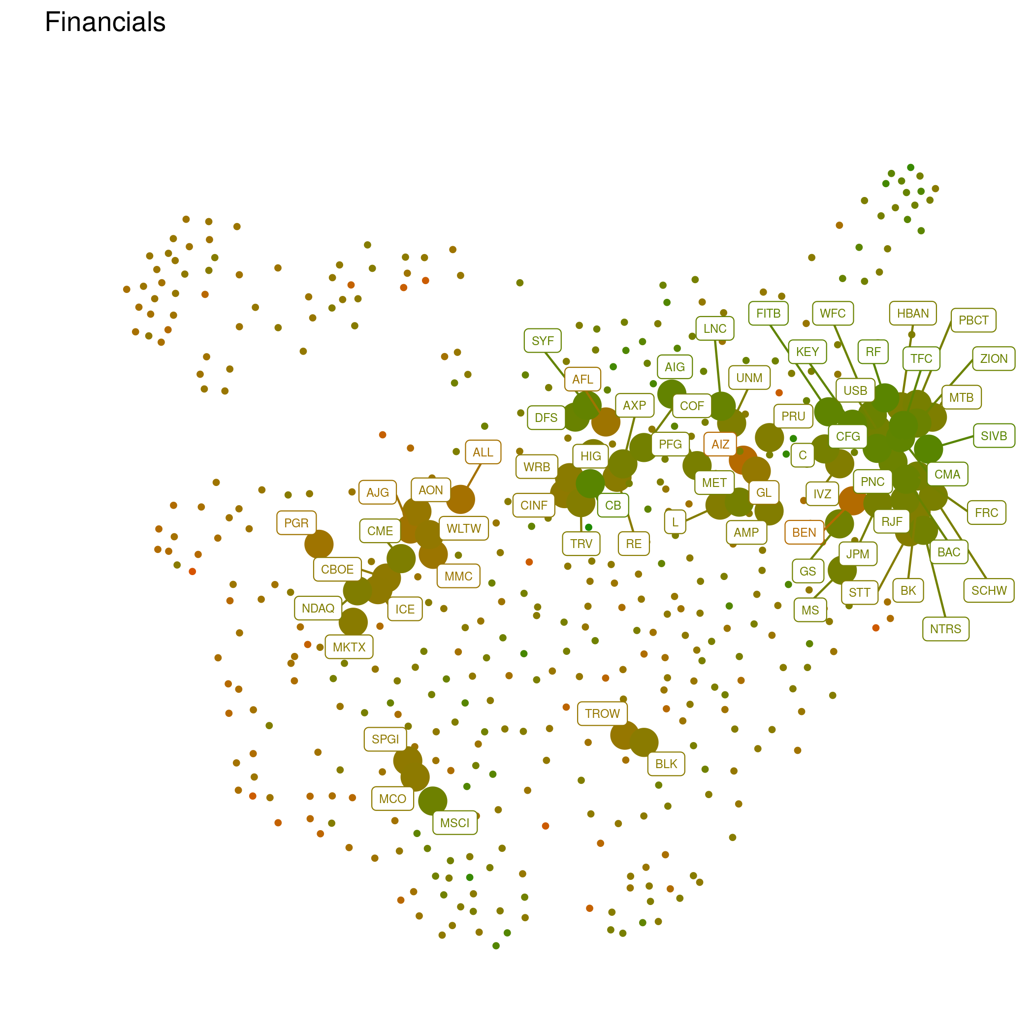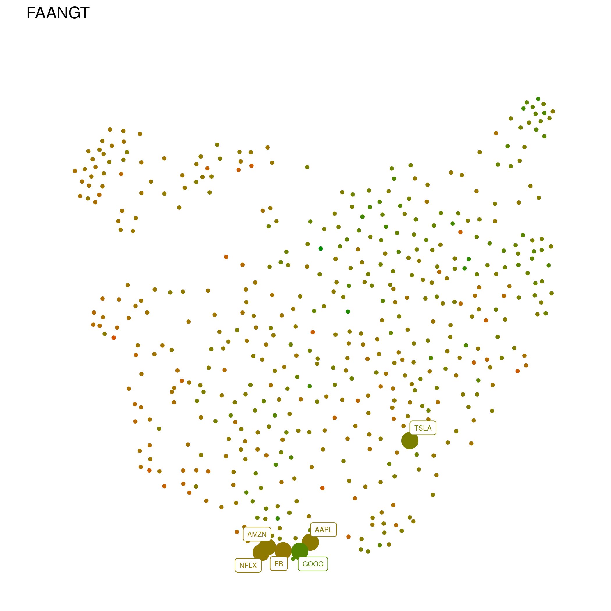 Every point represents a company, with close ones having similar price histories, and distant points dissimilar ones. This makes more sense when seen with labels for specific groups of companies, like the "FAANGT" (Facebook, Amazon, Apple, Google, and Tesla)