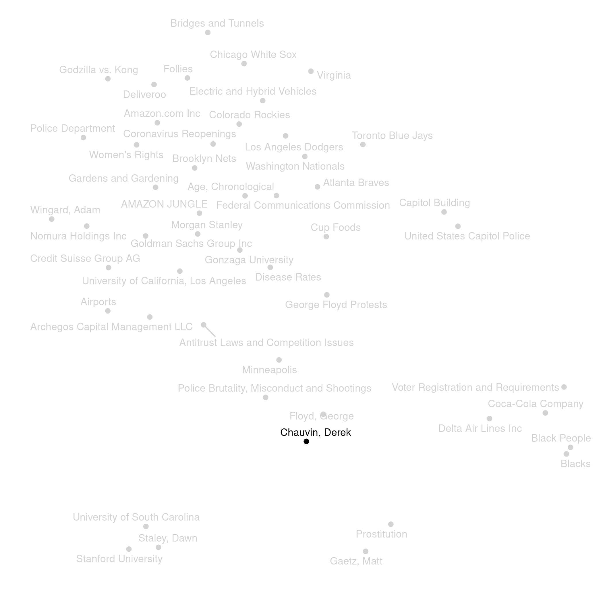 New in news this week, the trial over George Floyd's death. The specifics of Killer, victim, place, and protests for this event were the most statistically unexpected topics in the news, but Police Brutality, Misconduct, and Shootings as a topic only made it to 26th.