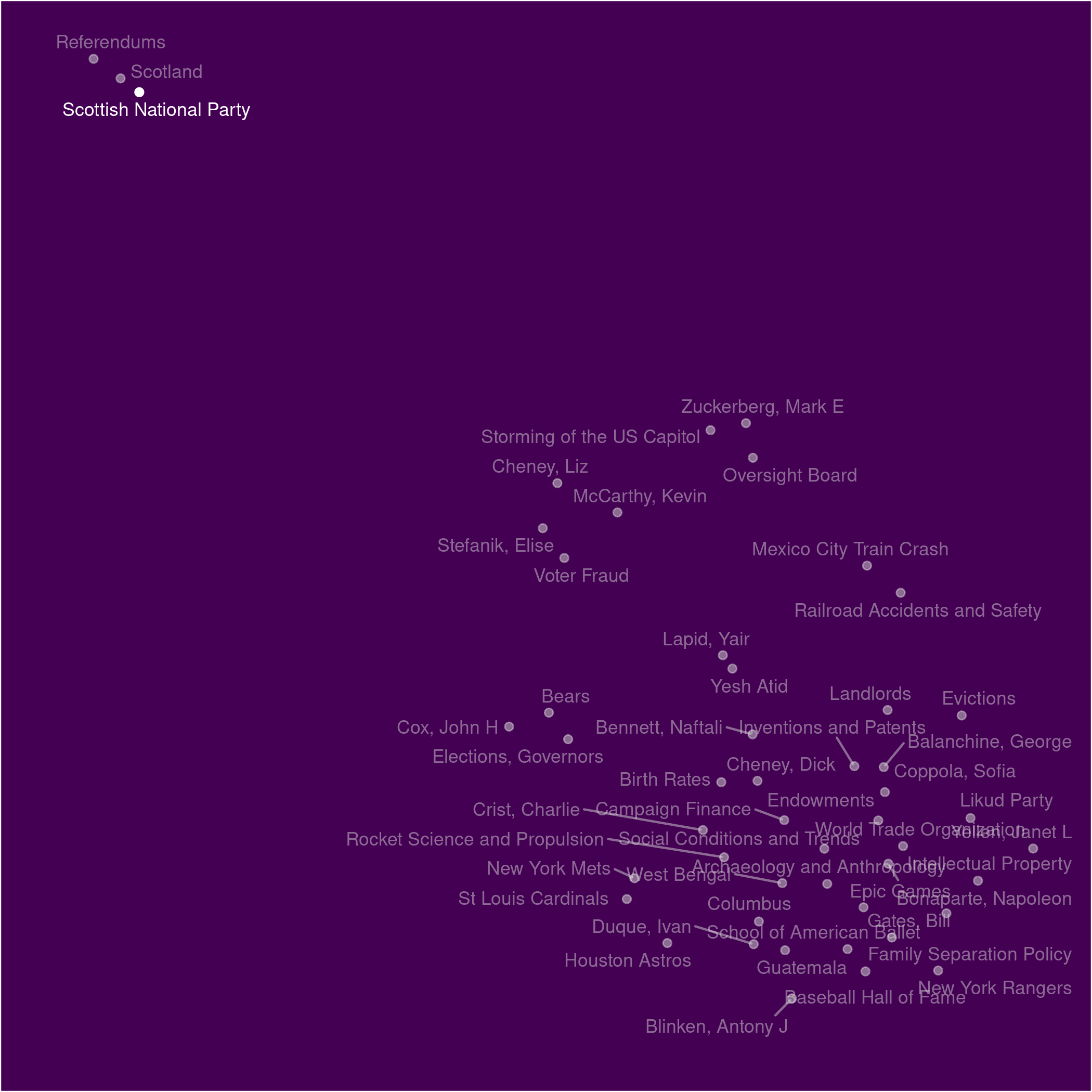 Liz Cheney might have taken the top place in the leaderboard of unexpected news topics, but look at that small cluster of Scottish news up there in the North (pun, I'm afraid, intended).