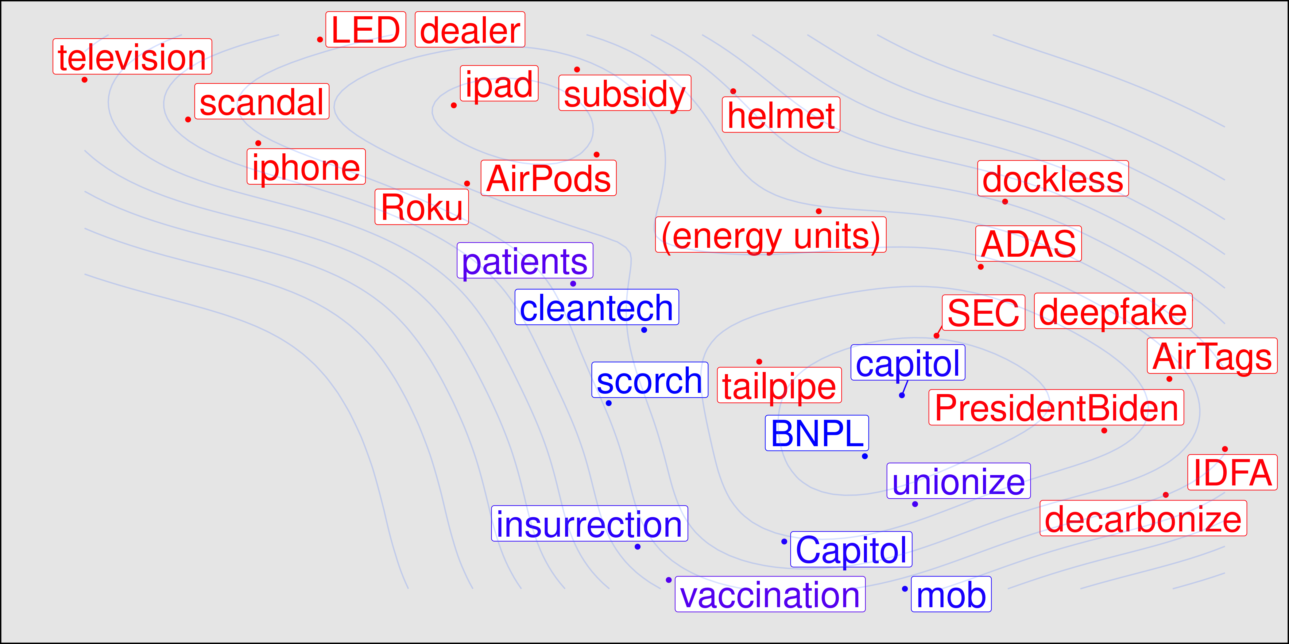 Sampling this semantic space, Politics and Pandemics as topics are out, Consumer products and Climate change mitigation are in. We aren't in a post-pandemic world yet, but the collective investment mind is doing its best to get back to what it was doing.
