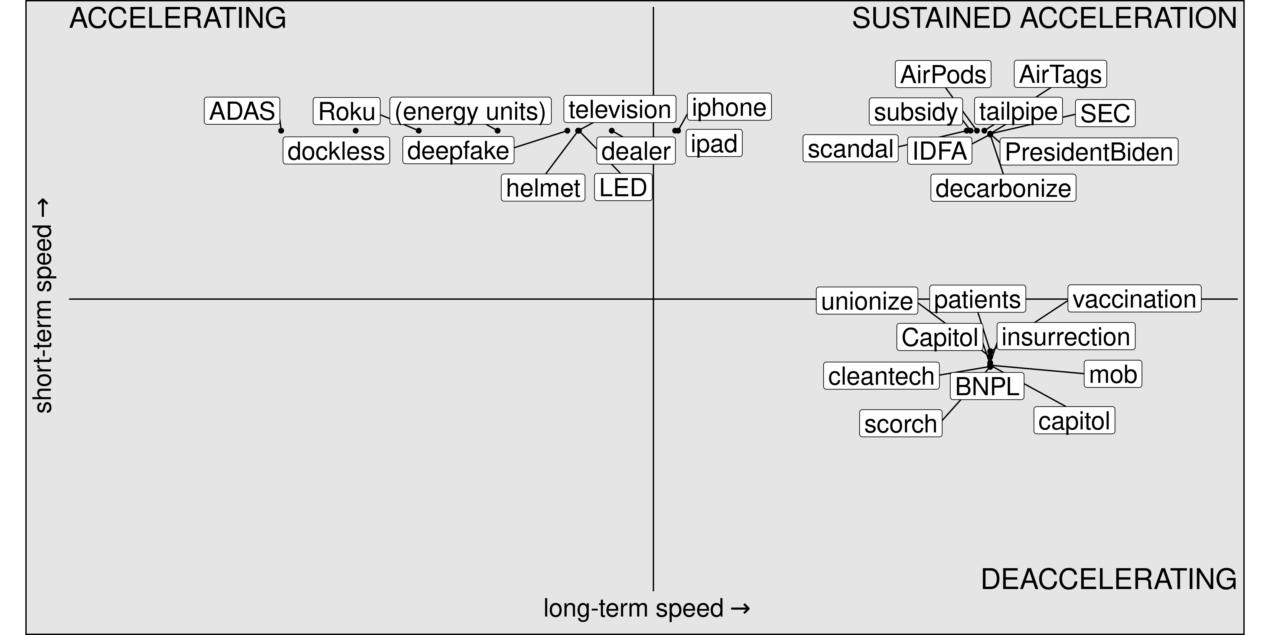 The most basic level of it is simply measurement: what's the investment world talking about? Or, more interestingly, what is it talking about in a different way? Crawling relevant publications and using NLP tools to extract and map the usage trajectories of different concepts, it's possible to extract patterns of change: