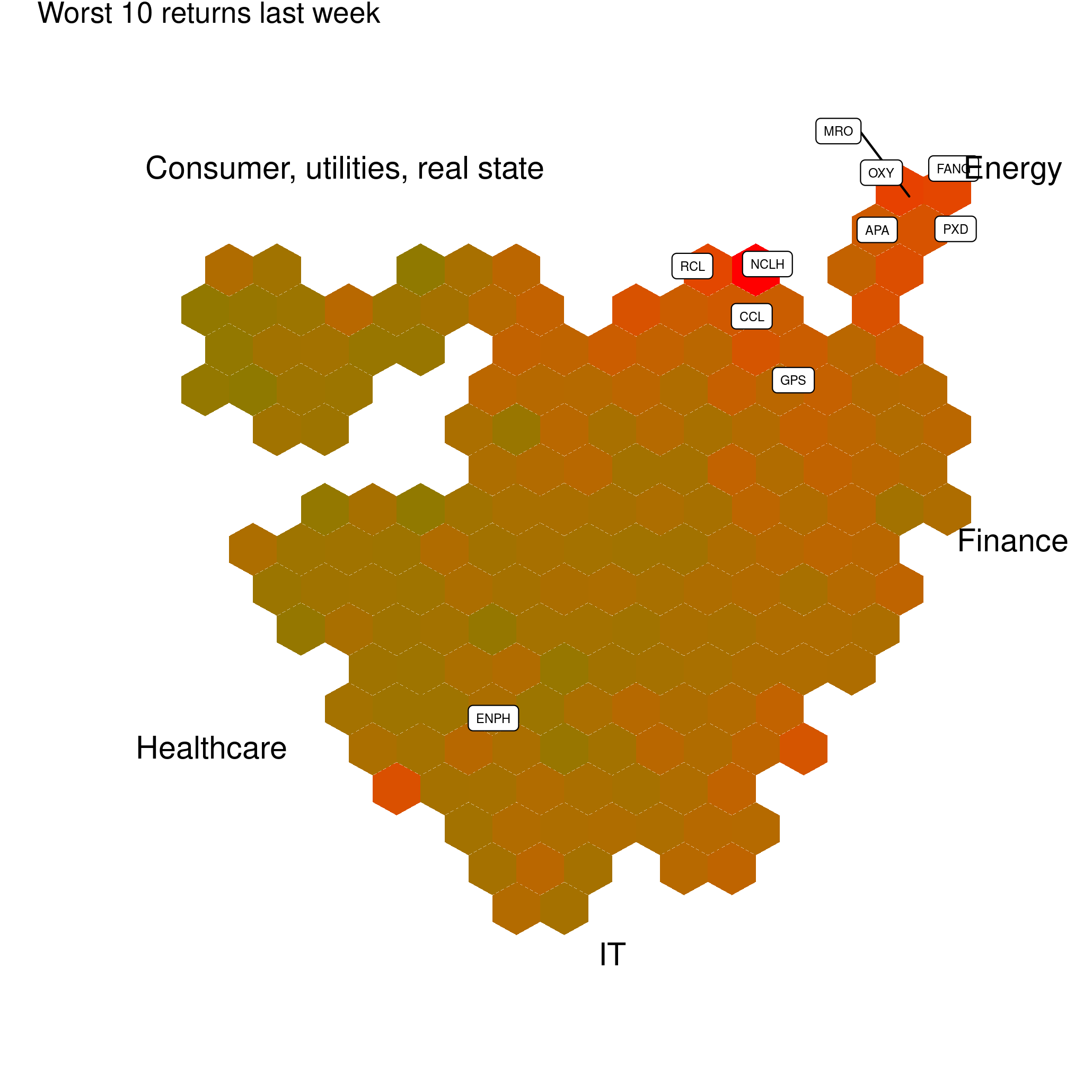 This week in the SP500’s latent cartography: not a good week to be on the Energy Peninsula... again.
