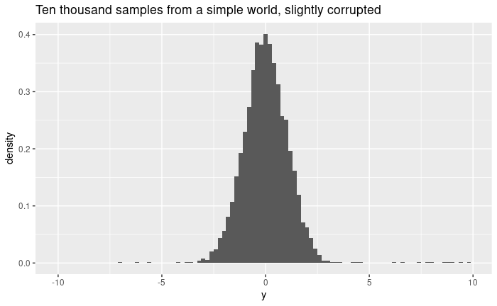 Even the sort of trivially simple setup that's not fit for tutorials (pun not intended) can work as a relevant example. Let's say you're observing the simplest of processes, generating numbers from a gaussian distribution with mean 0 and standard distribution 1, but every now and then, with some probability you don't know but you hope is less than, say, ten percent, the data is corrupted and you just get absolute garbage. (Real projects deal with more complex processes, but seldom with much cleaner measurements.)