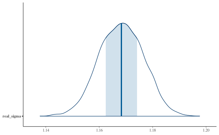 Using a more sophisticated tool to fit the same conceptual model doesn't really help. Here's the distribution of posterior samples for the standard deviation using Stan to fit a gaussian distribution to the data with reasonably scaled priors and good fit diagnostics: