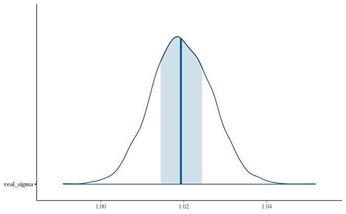 We can fit a model for our data with an explicit outlier-generating process just as well as a simpler one, using data-derived parameters for some of the priors. And just (well, "just") by specifying a more realistic model of your data generation process — one that explicitly says "sometimes the data is pure garbage" — we get a posterior for the standard deviation much better aligned with the true one: