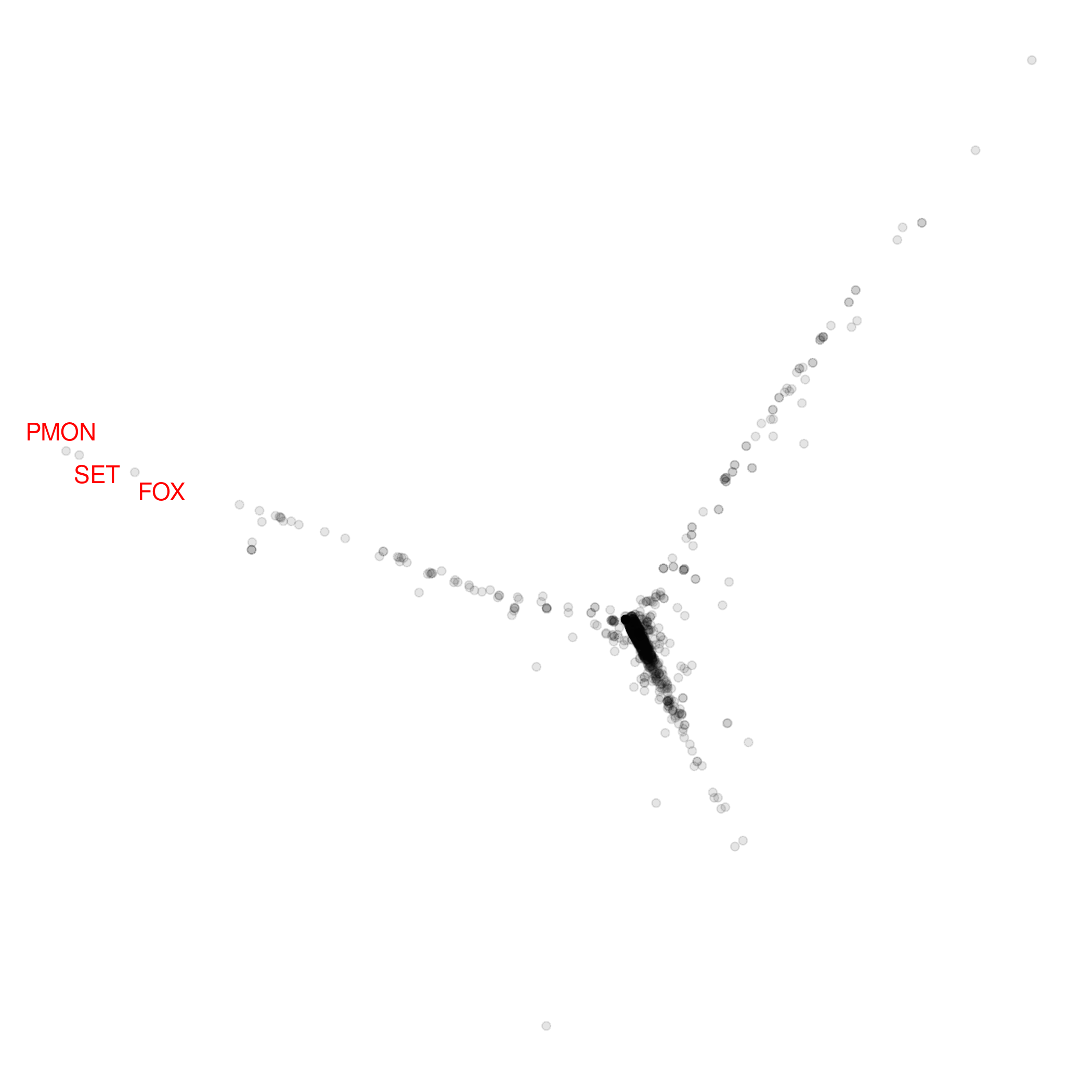 And yet, there's more to this galaxy than its core. Keeping in mind that any two-dimensional map of an intrinsically multidimensional data distribution is going to be at best conceptually useful, but never entirely right, we see in the map three "branches" - sets of coins with prices that behave increasingly out of step with the Bitcoin Core, and also with each other.