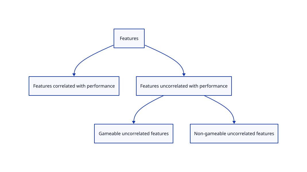 What about gameable features uncorrelated with performance? Those are very seldom discussed because many organizations think of them as correlated with performance. Think about things like speech patterns, dress codes, or, closer to usual (for now) AI filters, CV formatting and word choice.