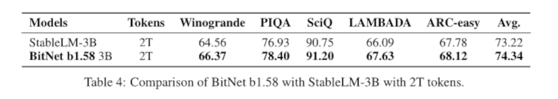 The key part of the abstract: In this work, we introduce a 1-bit LLM variant, namely BitNet b1.58, in which every single parameter (or weight) of the LLM is ternary {-1, 0, 1}. It matches the full-precision (i.e., FP16 or BF16) Transformer LLM with the same model size and training tokens in terms of both perplexity and end-task performance, while being significantly more cost-effective in terms of latency, memory, throughput, and energy consumption.